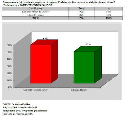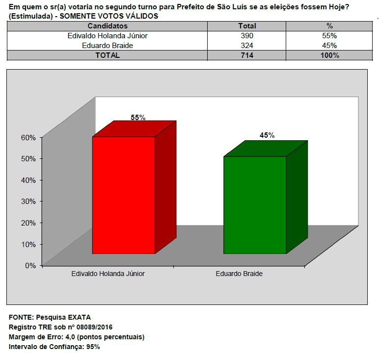 Considerando-se apenas os votos válidos, o prefeito Edivaldo tem 55% e Eduardo Braide 45%.